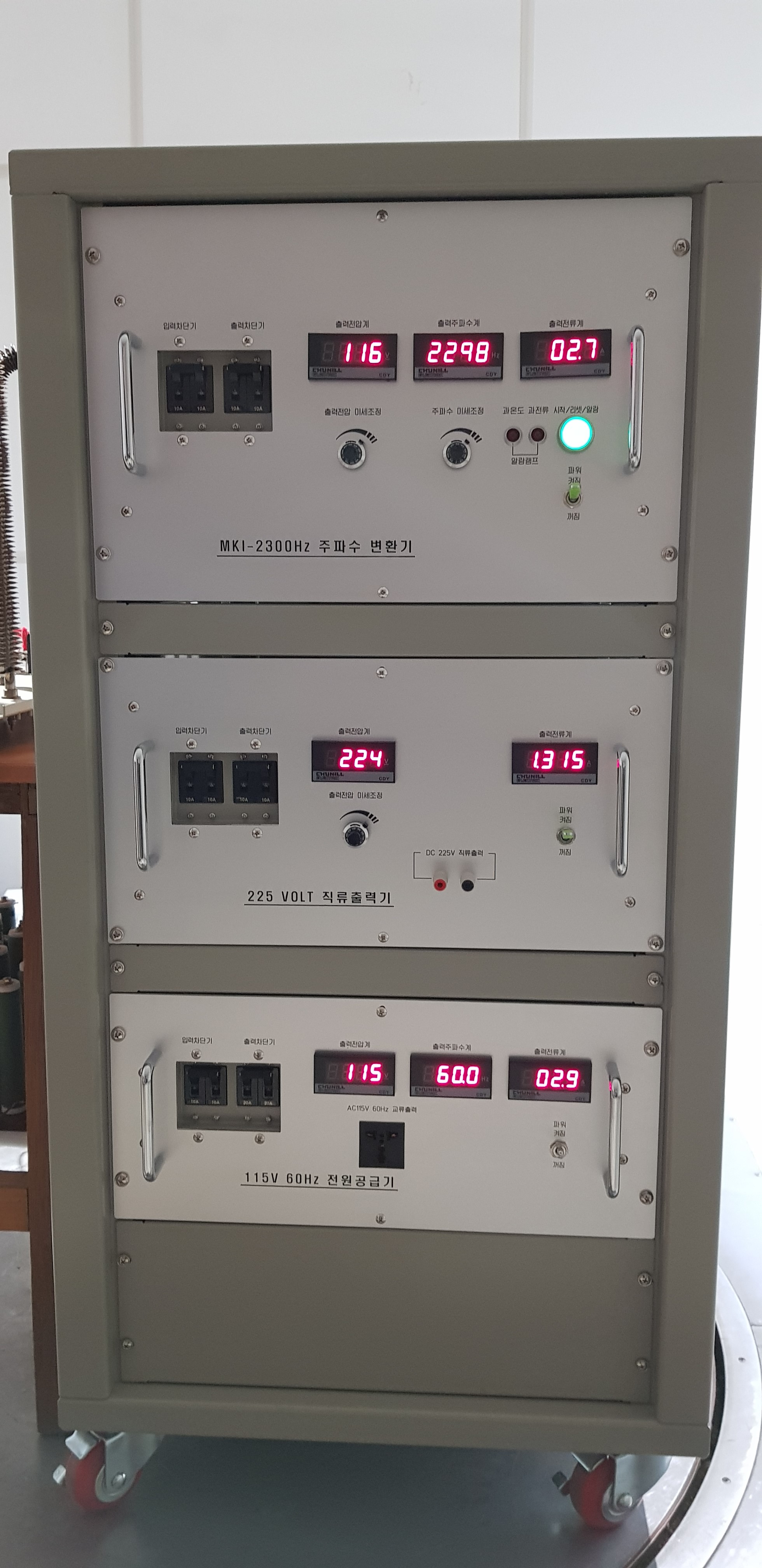 60Hz를 1상 0-115V 2300Hz로 변환시키는 전압주파수가변장치인 AC POWERSOURCE입니다.